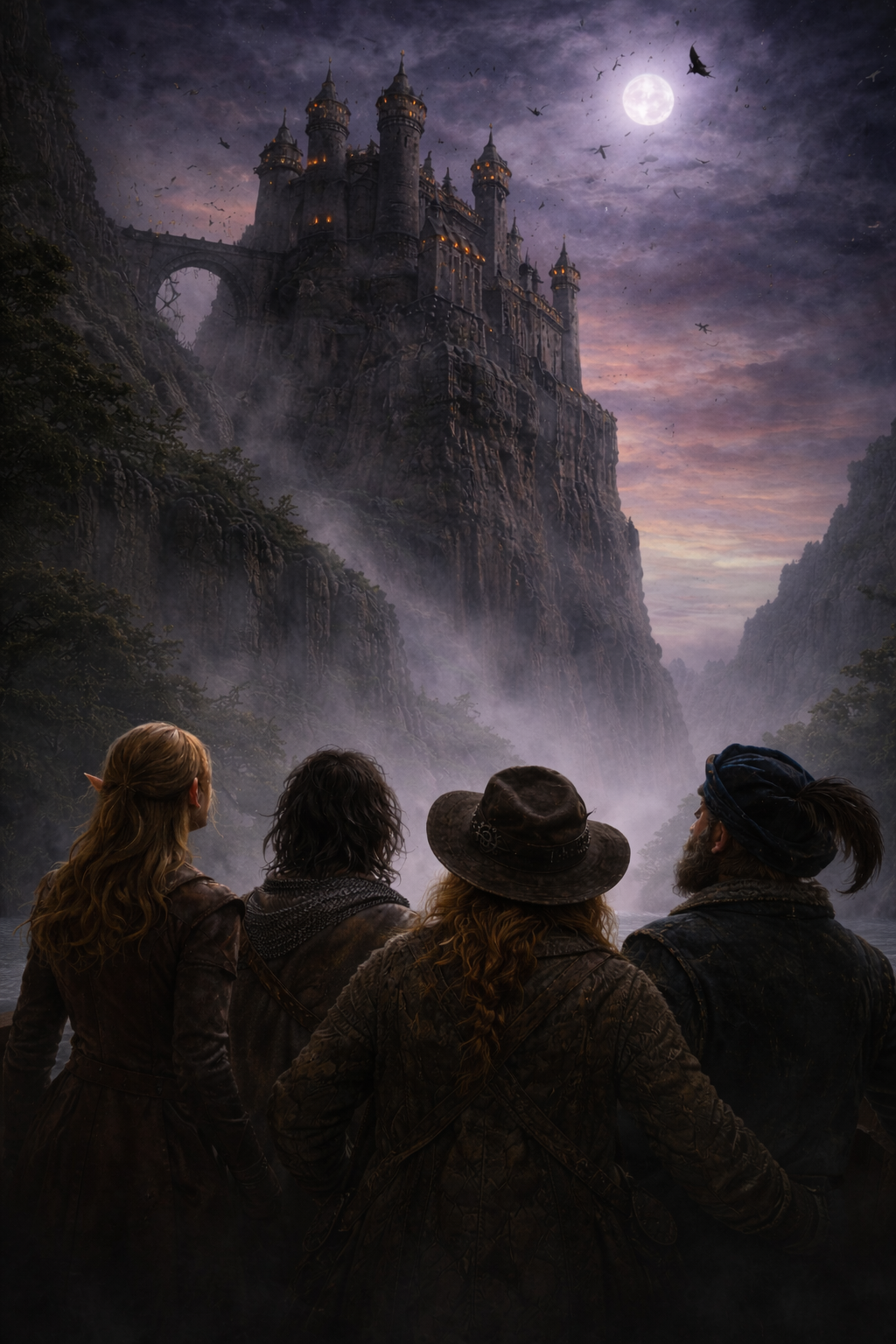 The company defies an armed attempt to seize their riverboat, scouts the ominous heights of Castle Wittgenstein, and ultimately returns with food and caution into the haunted woods, where signs of hidden camps and darker forces suggest the true danger lies beyond the village itself.