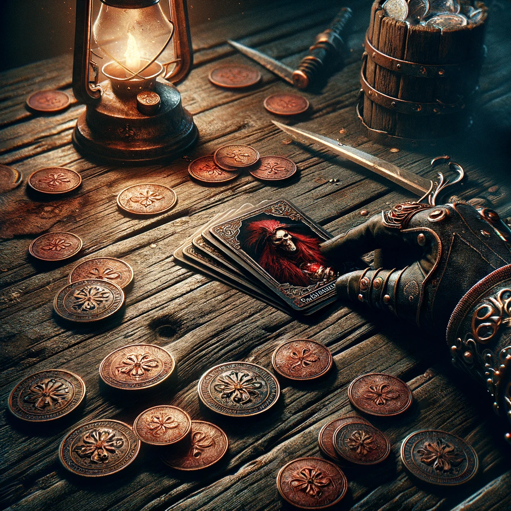 As the night wore on, Qavitrae and Felrick engaged the inn’s patrons in a game of Scarlet Empress, the stakes rising with each round. Thindruk, drawn into the game, found himself on the losing end of Felipe’s uncanny luck, the Bretonnian’s pockets jingling with his winnings.