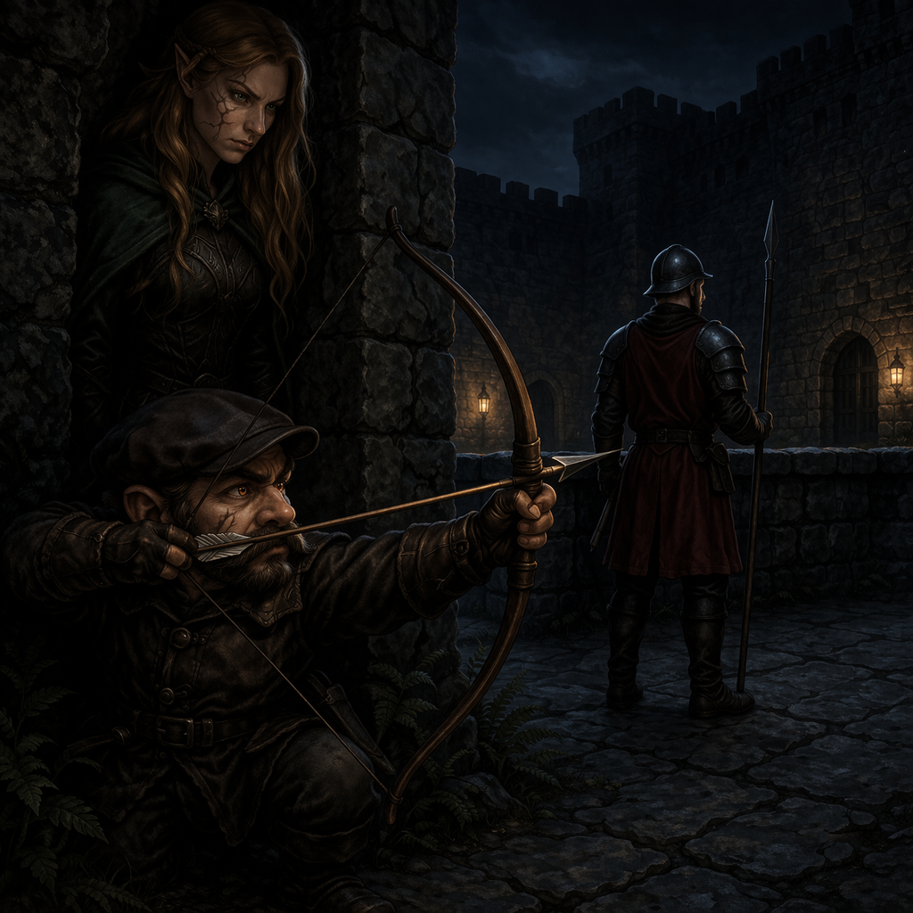 The courtyard lay before them, a hollow space beneath towering walls. The castle loomed above, its stone bones cracked and weathered, its purpose long since twisted into something foul. Lanterns burned along the walls, but sparsely. The guards were few. Complacent.