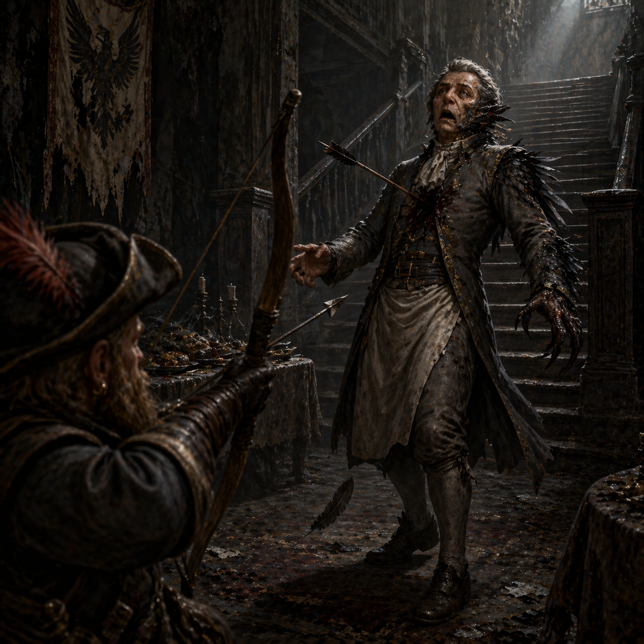 The illusion cracked. One of his hands, briefly glimpsed, was no hand at all but a claw. Feathers crept along his sleeve. Something avian and wrong was buried under the servant’s guise.